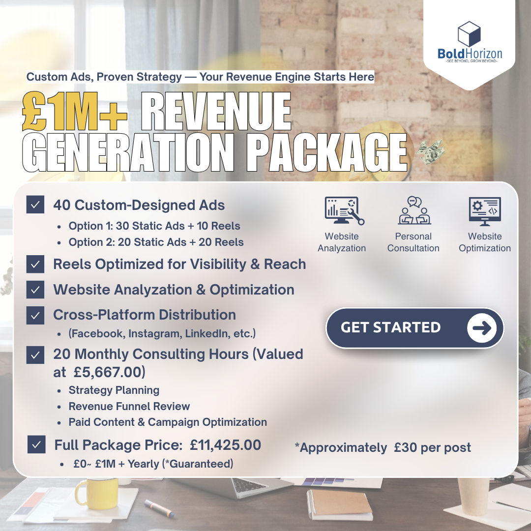 The £1M+ Revenue Generation Package is a premium, done-for-you growth engine for brands aiming to break and sustain seven-figure revenue. It combines high-volume creative, advanced optimization, and deep strategic support so every channel and campaign works toward ambitious income targets.