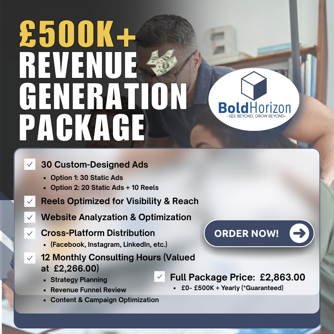 The £500K+ Revenue Generation Package is the top-tier solution for brands ready to scale aggressively and turn marketing into a reliable, revenue-producing engine. It is designed for businesses targeting mid- to high six-figure returns, with every activity aligned to clear revenue goals and KPIs.